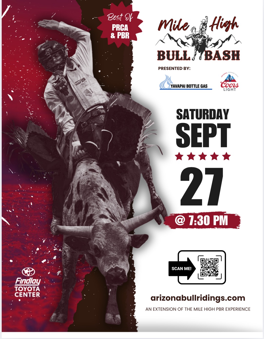 The Yavapai Bottle Gas Mile High Bull Bash, presented by Coors Light is set for Saturday, September 27, 2025, at the Findlay Toyota Center in Prescott Valley, this high-energy event is set to deliver a thrilling night of non-stop, bone-rattling bull riding action.